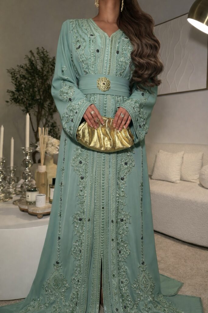 Luxury silk kaftan crafted from premium Silk Jawhara fabric, featuring handmade crystal embroidery, perfect for formal events, weddings, Eid, and modest fashion lovers.