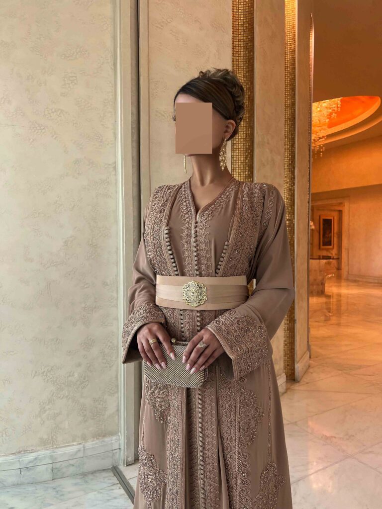 Elegant Handcrafted Randa Kaftan, made from authentic Silk Jawhara Randa, featuring intricate hand-sewn embroidery. Includes a matching belt for a tailored fit. Perfect for formal occasions, weddings, and cultural events.