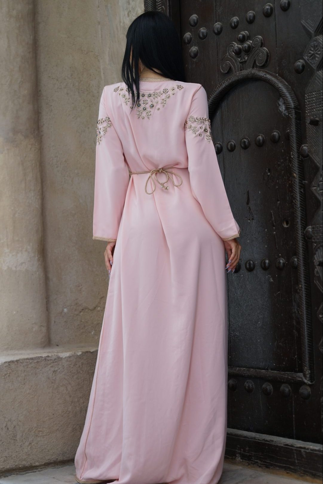 Indulge in the luxury and refinement of this hand-embroidered crystal pink kaftan. A perfect blend of timeless elegance and modern sophistication, this piece is a must-have for those who appreciate quality craftsmanship and effortless style.