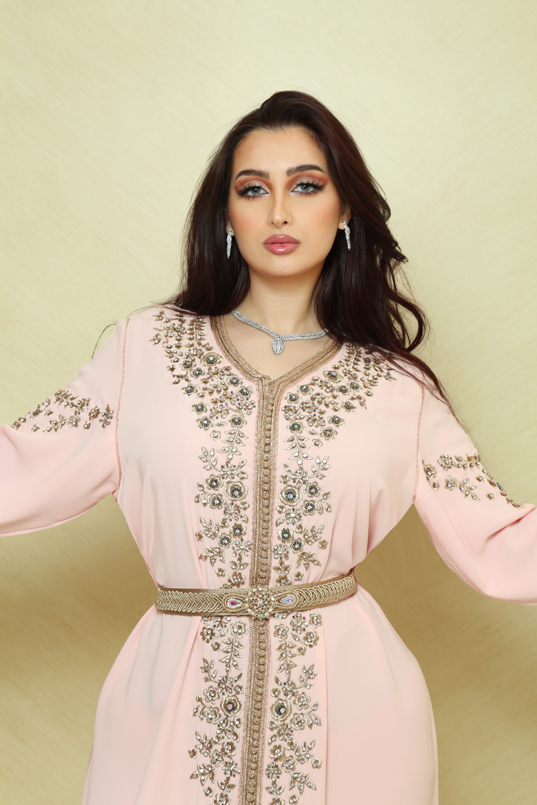 Indulge in the elegance of this hand-embroidered crystal pink kaftan, a perfect fusion of luxury, sophistication, and contemporary modest fashion. Designed to captivate, this exquisite piece is adorned with over 250 shimmering crystals, each delicately placed by hand to enhance its charm.